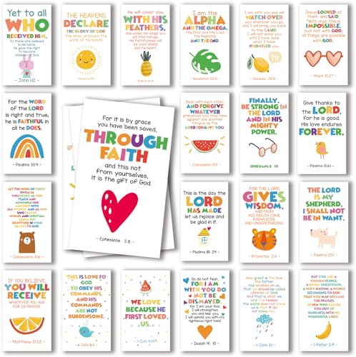 - 60 INSPIRING BIBLE VERSE CARDS: Beautifully designed with child-friendly artwork and uplifting Scripture.