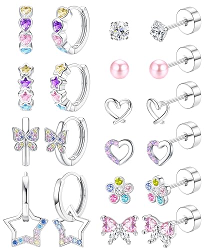 - 12 pairs: 10 screw-back stud earrings (star, flower, butterfly, rainbow, CZ), 2 small huggie hoop earrings