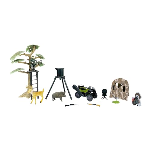 - Durable 13-piece set including an ATV, hunter figure, tree, treestand, feeder, ground blind, toy bow and arrow set, rifle, shotgun, chair, whitetail buck, hog, and turkey decoys.